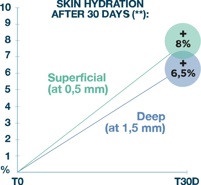 [Graphs shown on this page: Skin hydration after 30 days on the volar surface – graph showing increases at 0.5 mm and 1.5 mm depths. Skin plastoelasticity after 30 days on the dorsal surface – graph indicating improvements in superficial and deep layers.]