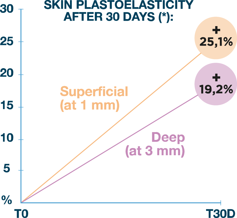 Pilot Study on Moisturizing and Elasticizing Activity (Published in PRIME Journal, January/February 2020): This open pilot trial assessed hydration and plastoelasticity on photo-exposed (dorsal forearm) and non-exposed (volar forearm) areas over 1 month, with measurements at baseline, 2 weeks, and 1 month. Superficial hydration on the volar surface increased by 8% after 30 days, while deep hydration rose by 6.5%. Superficial plastoelasticity improved by 25.1%, and deep by 19.2% on the volar surface. On the dorsal surface, plastoelasticity showed a 19.2% improvement after 30 days. Statistically significant changes in hydration and plastoelasticity were noted as early as 2 weeks, outperforming some hydrolysed collagen products that require at least 4 weeks for similar observations.